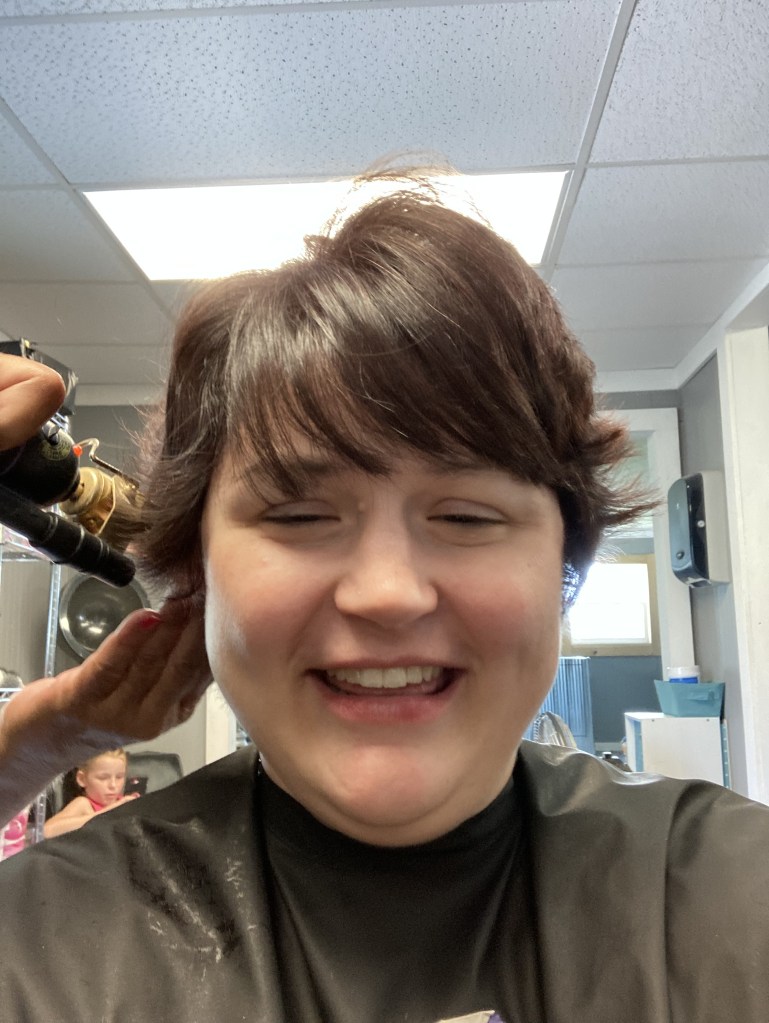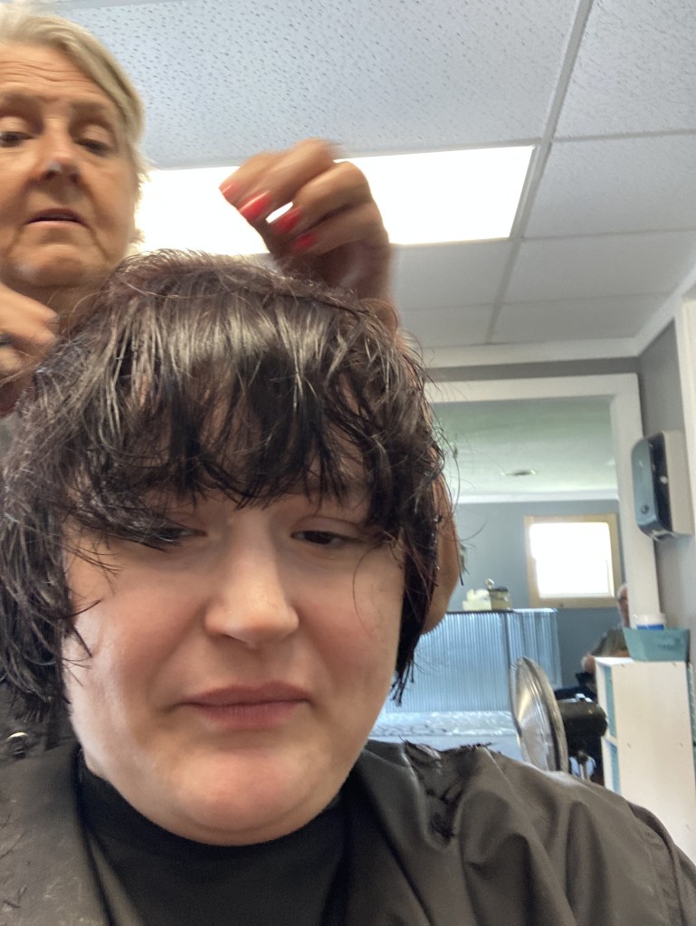 What no one can see is that there were two little girls running the salon that day. My niece, was not too happy about the loss of my long tresses, and Gina’s granddaughter who was excited and wanted my hairdo. Watching them watch me was hilarious. I couldn’t help but laugh at both of them watching Gina cut and work on my hair.