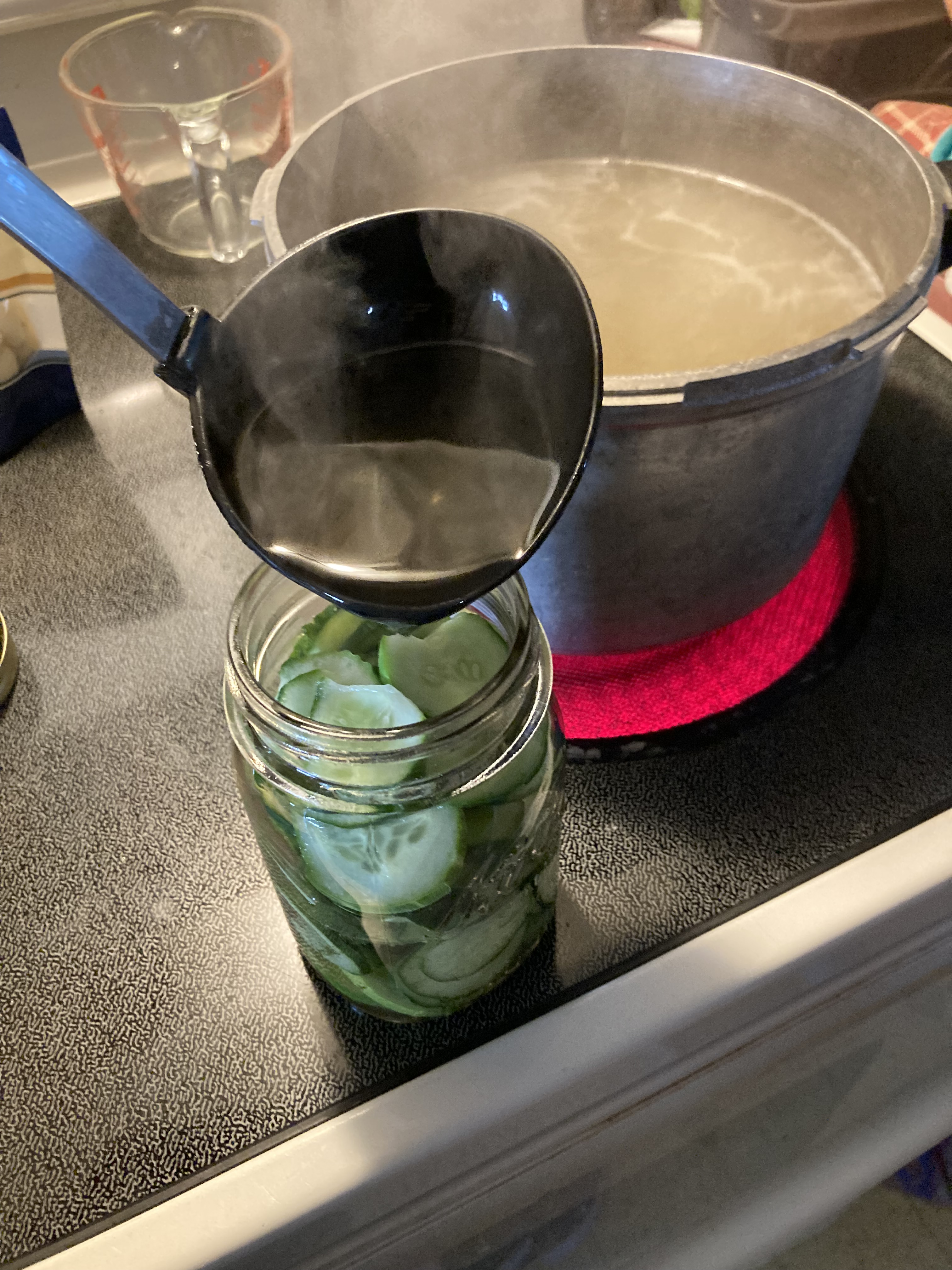 Unfortunately, we lost one jar to a certain Uncle who showed up conveniently after I finished a new batch this morning. Plus we added garlic to this mixture and I would have liked to taste-tested before giving it away. However, I was there saying yeah well we have all those up there we got plenty. We Alsmans love our pickles what can I say!