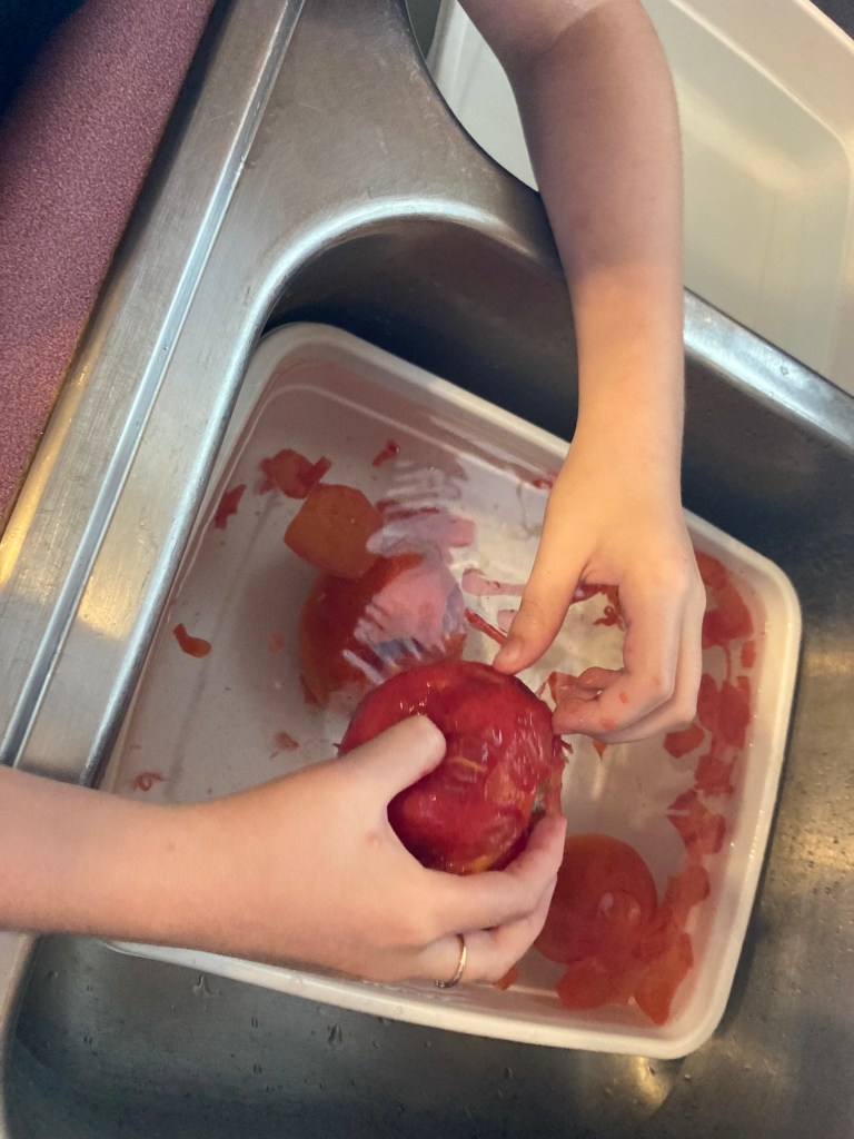 It’s been fun watching her pick up on some of this slice of gardening. While we were all working individually on our tasks at hand I kept hearing this phrase. My girl, kept saying here’s ‘a naked tomater’ with each freshly warmed and peeled tomato. It became an actual thing to hear over and over. She was happy, excited and working so I was enjoying listening to her and her process.