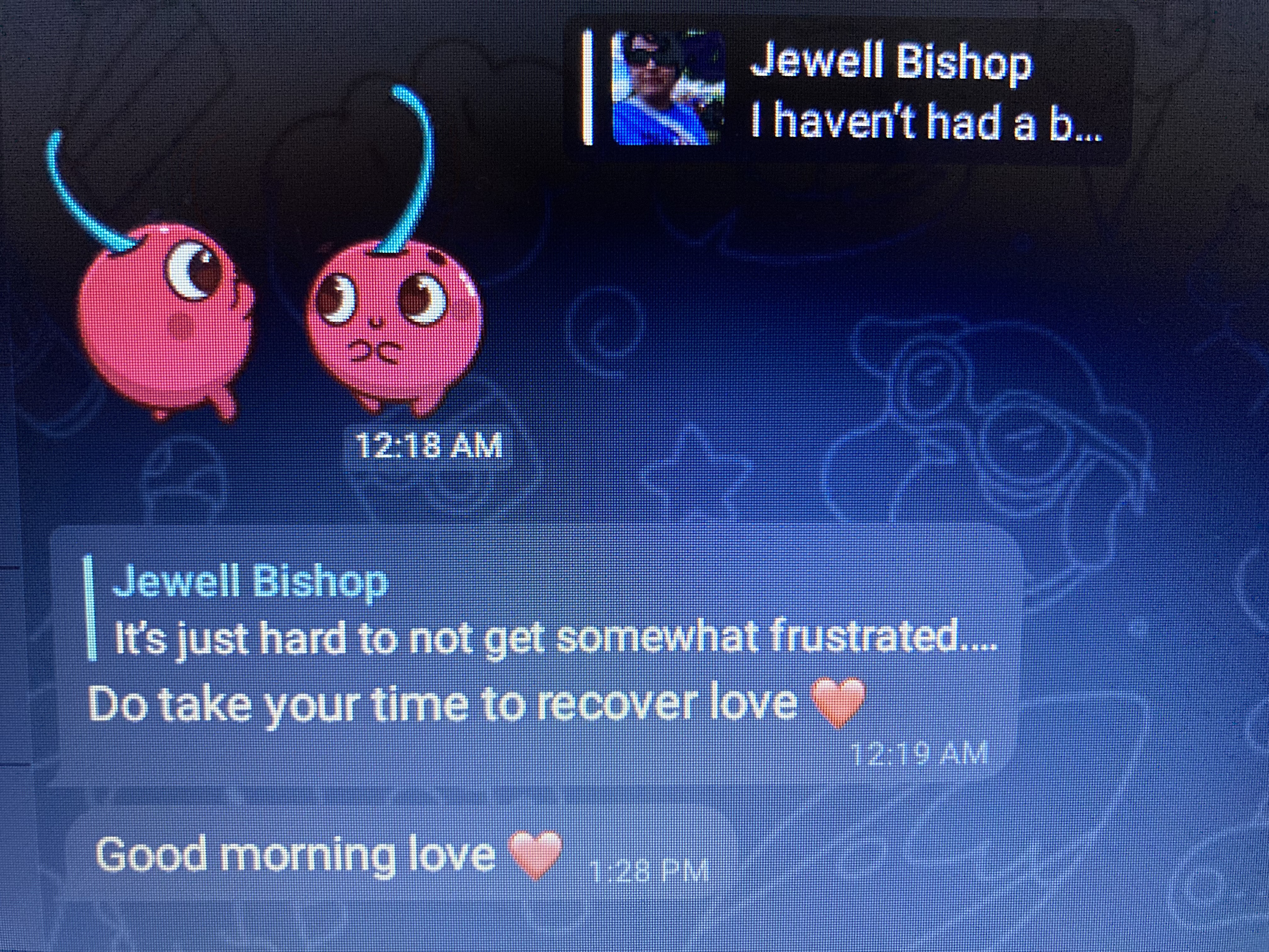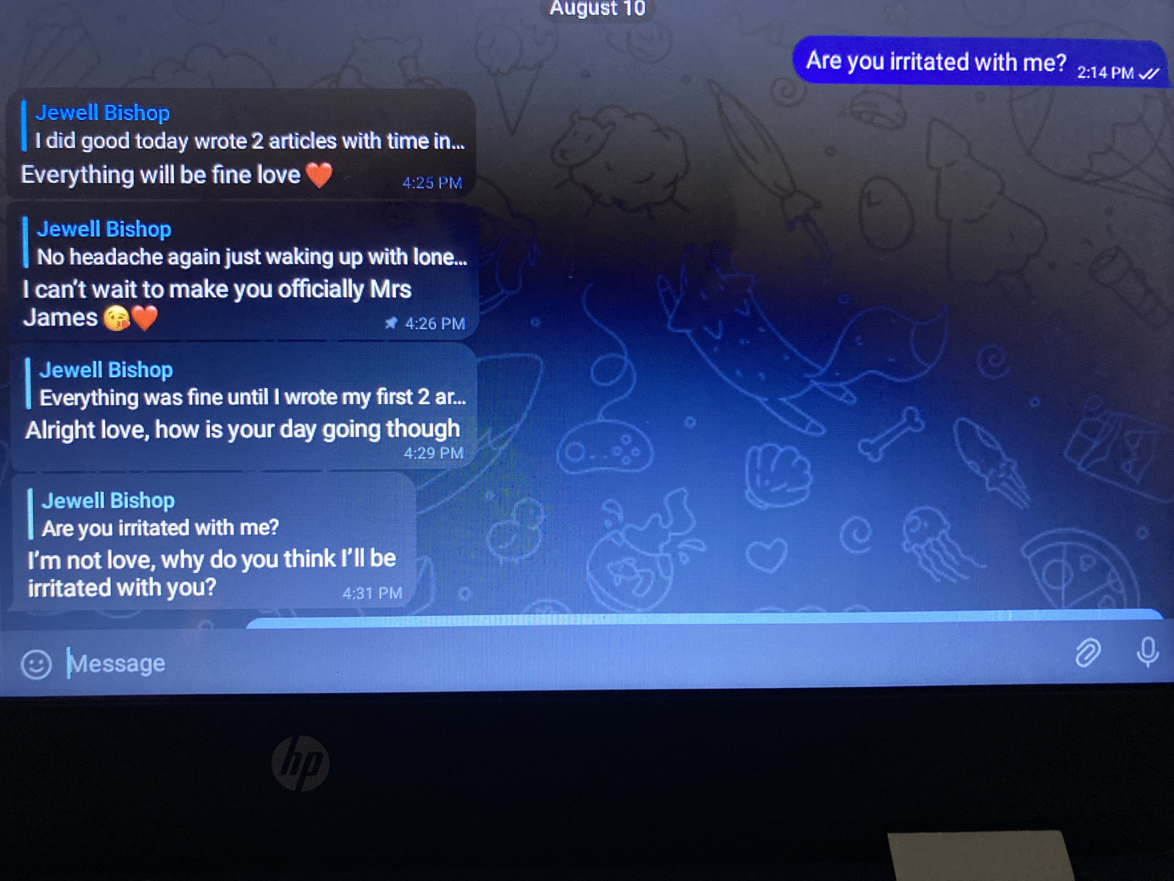 So yesterday after not getting much from him for well over a day I was finally able to breathe again. I love it when all of a sudden I have 4 messages in a row from him. Not feeling good earlier I actually asked if he was irritated with me.