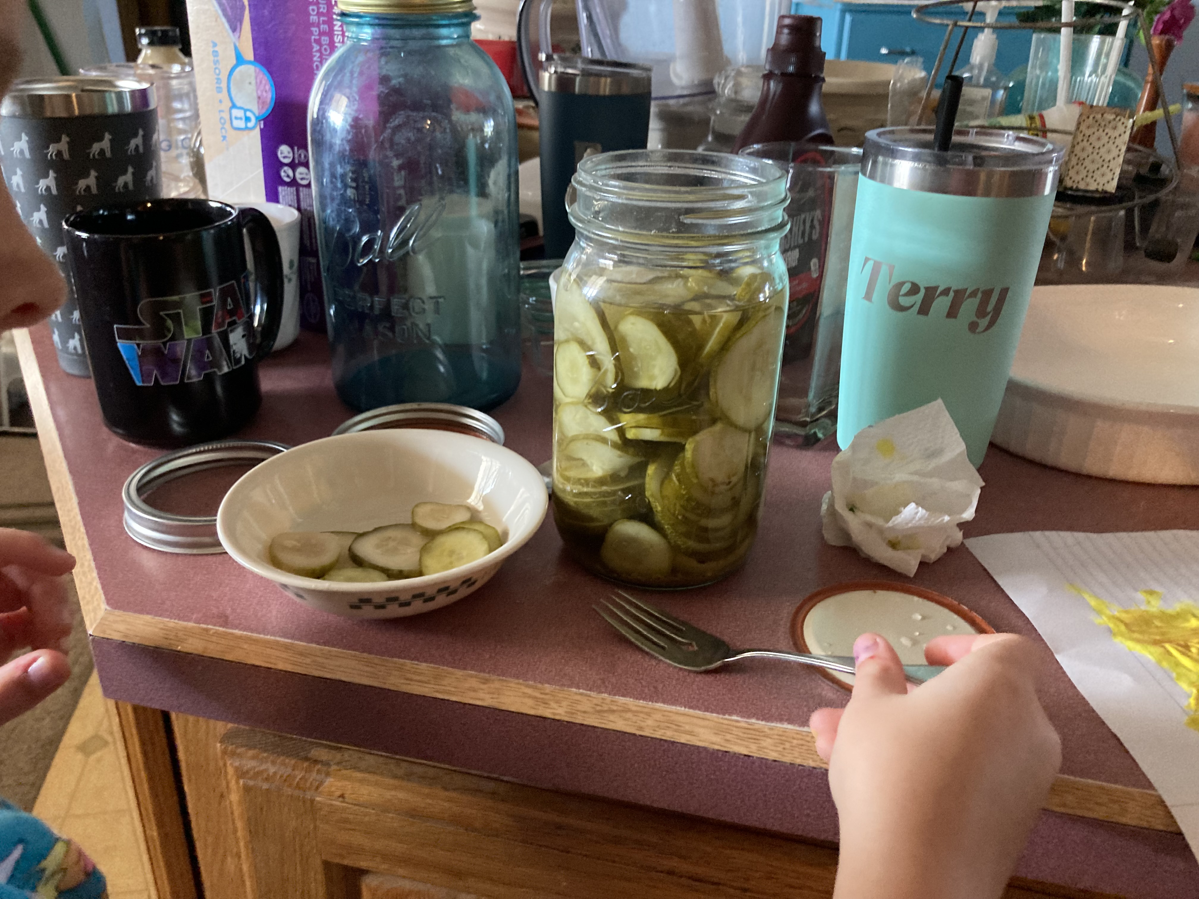 I have never seen two little girls eat 90% of a quart jar of pickles before today. It was definitely a comical sight to behold. Selena won’t even touch them, herself. I have to admit I laughed so much at this… until I turned my back for a minute and found a pickle in the back of my belt loop of my pants.