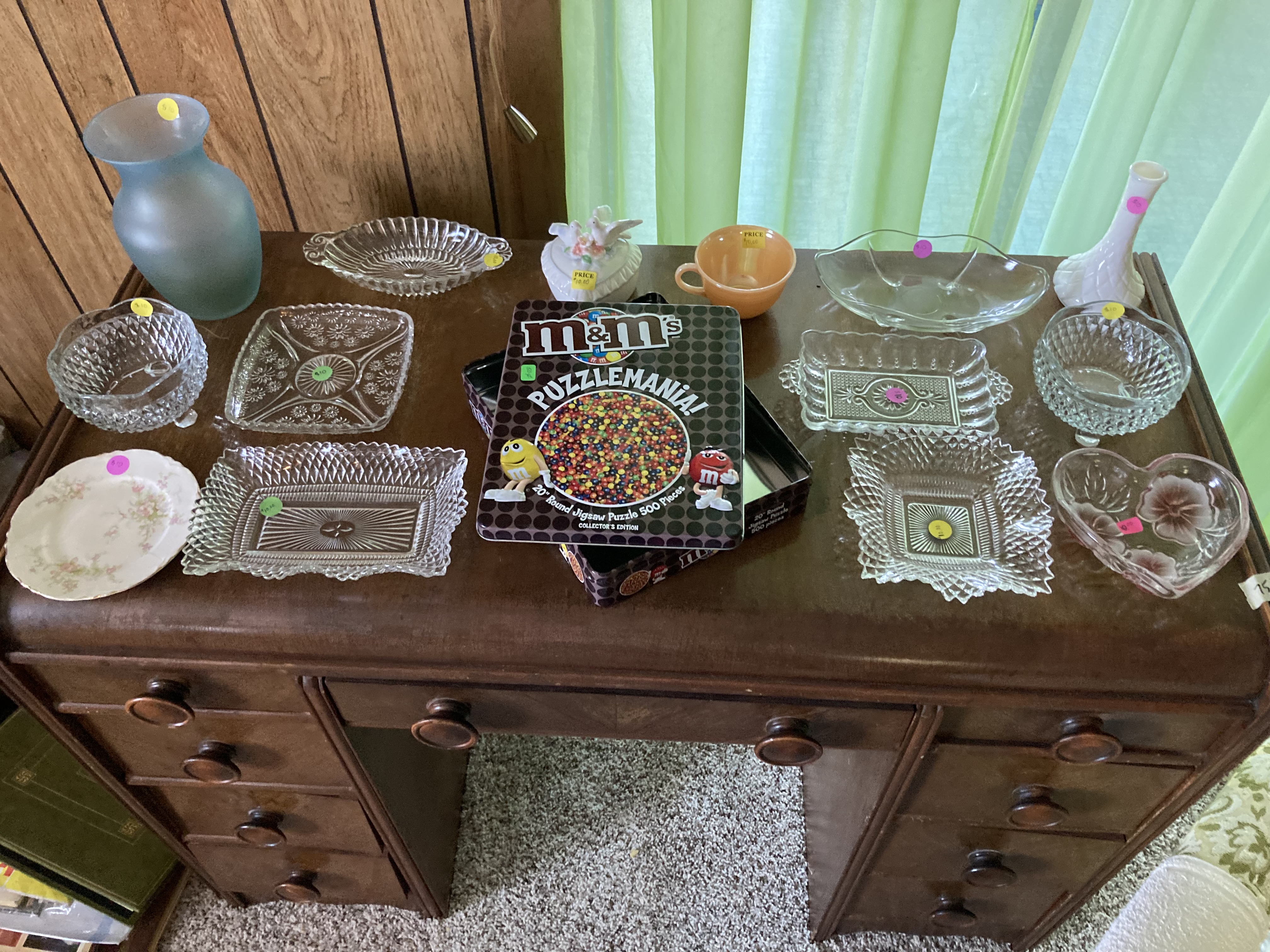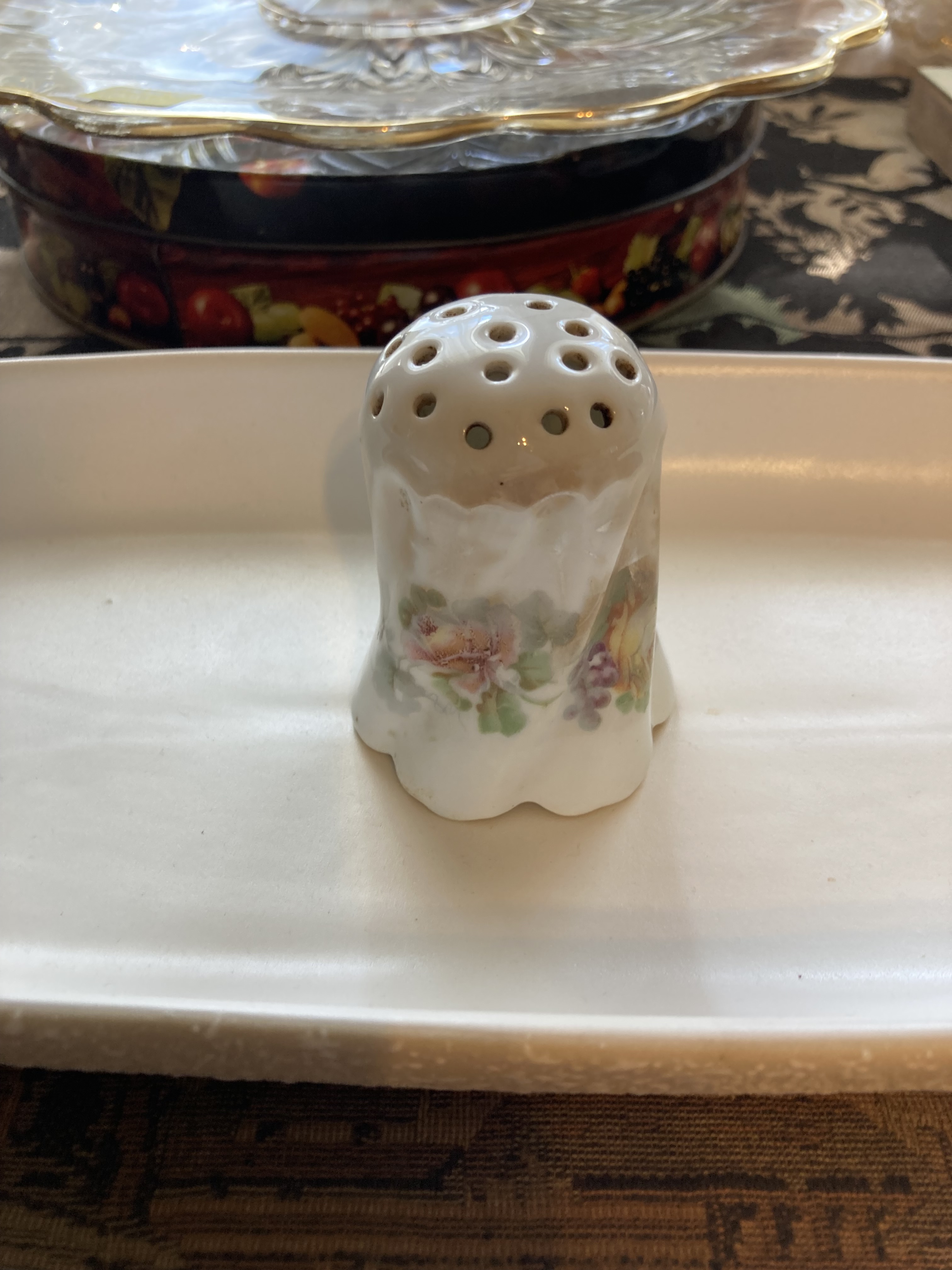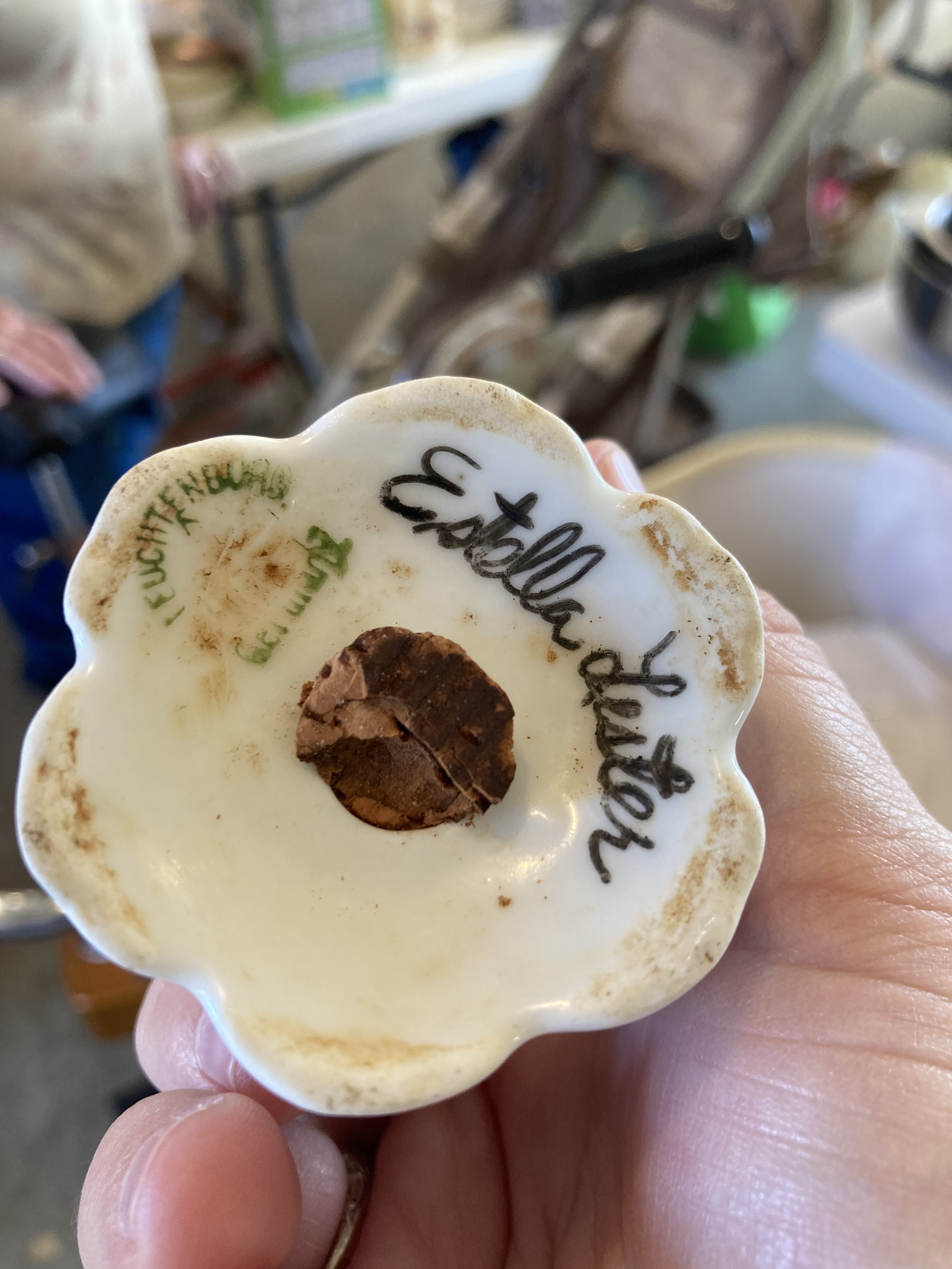 Looking through our tables a little closer right before closing up an interesting find was made. Weeks of going through these tables all of a sudden this one item was found today. It has the name of my Dad’s Grandpa’s Mom. Estella Lester was her name and the imprint of Leuchtenburg, Germany. This is an old family heirloom and there’s only one when it seems there should be a set.