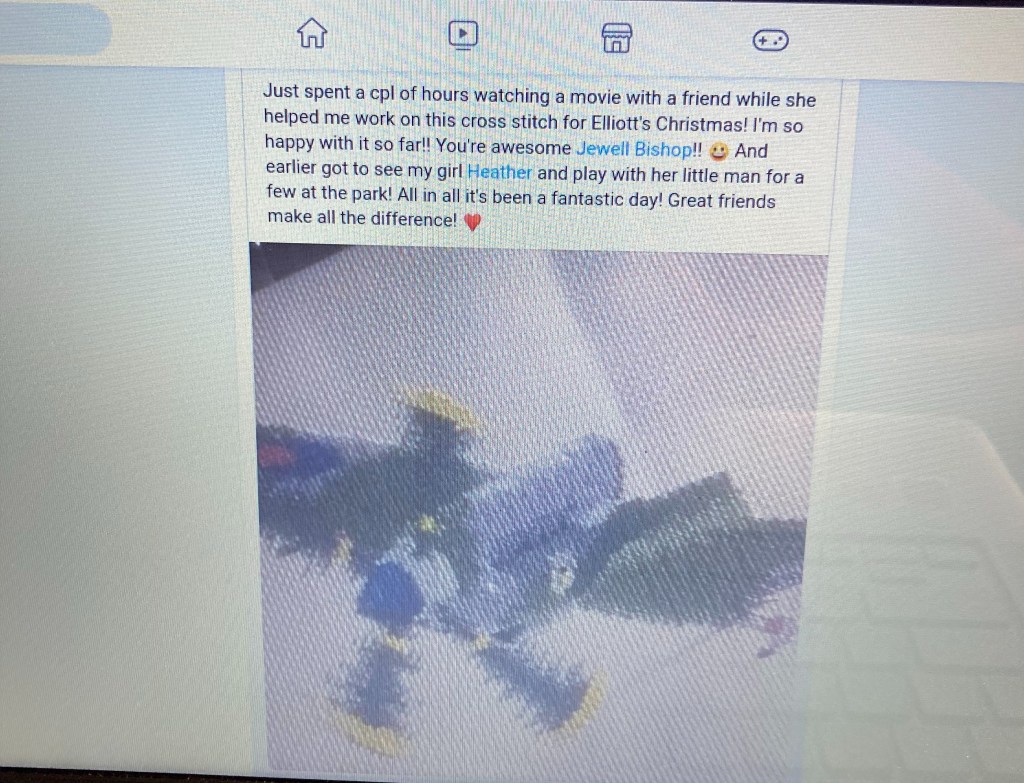 All of a sudden I noticed this notification when it said her name it took me back a bit. We exchanged a lot of texts and some posts on Facebook, but this one seemed unfamiliar to me. I remember that cross-stitch piece though.