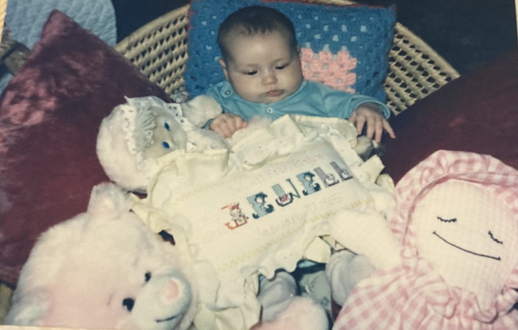Denise married my Dad’s cousin and I consider her almost an aunt more than a cousin, but she made this cute little pillow for me. Here I am with these pink, fluffy, pillowy figures of my early days in this world. I wonder if Denise had already put the idea of cross-stitch in my head through this pillow, before Aunt Mary did.