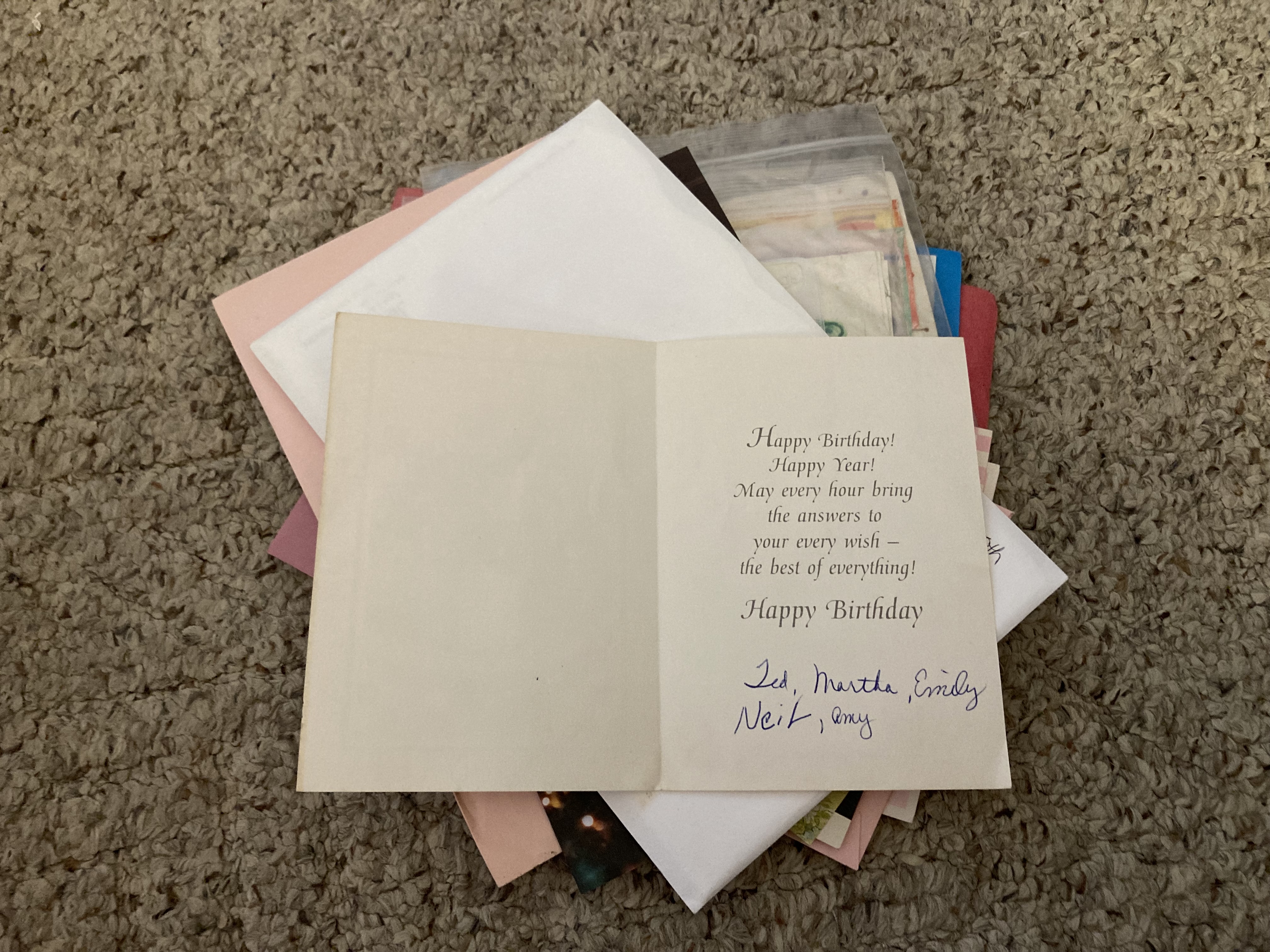 So this is Neil, Jared, my brother and Caleb another cousin. These three were three peas in a pod. James my younger brother was a little younger. As you can see these names were signed by them not by one person. Neil signed this birthday card for me. I only wish I knew which birthday, Jenny Rose is not mentioned so it must be before she was born.