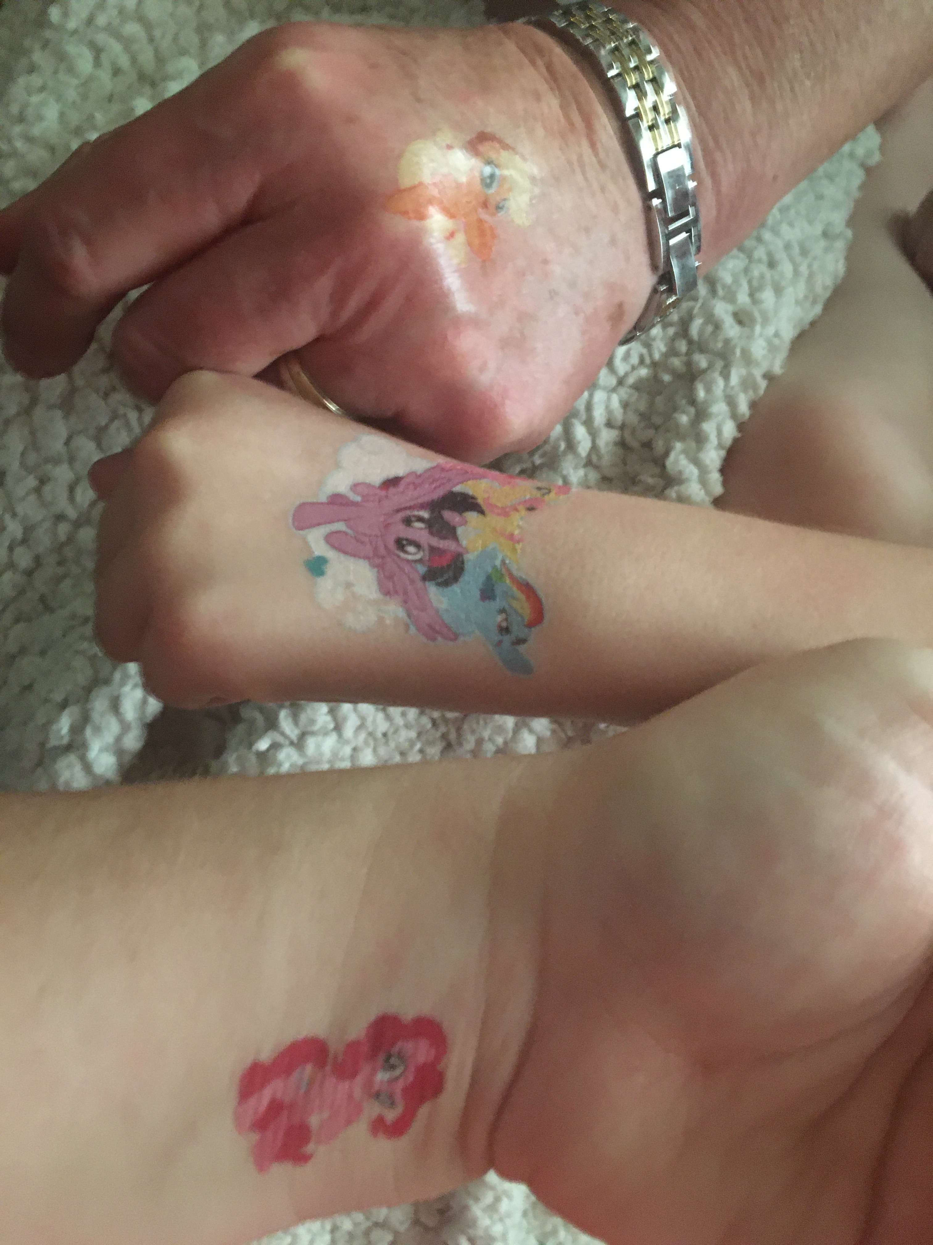This question is really quite funny. I am not of the tattoo sort and neither is Bryan. I don’t remember even being on the washable tattoo bandwagon that much until a couple of years ago. A little girl, my niece put a tattoo on my wrist and on Mom’s palm. We haven’t done this since or again, by the way.