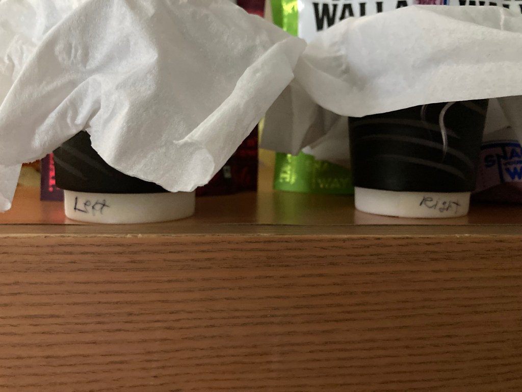 It also came to my attention that we had other plastic cups in the bathroom that I had not seen previously. So as soon as I had woken up enough to see them hiding in the far corner of the bathroom I was able to throw these coffee cups out as you can see the water was absorbed into the cups. I was so happy to see the plastic cups and was able to pitch the coffee ones out. I still had enough solution left it would just be one more night so I wouldn’t worry about it any more than I already had the previous evening.