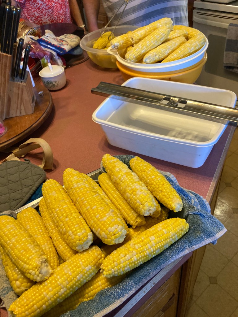 Yes it is work. These memories will forever stay with me and are why I couldn’t let the corn go to waste last night when I saw the two crates full. This is everything I have loved about being a family farm. Our family knowing each task and stepping in when needed to. I have done each task. Getting the corn, shucking the corn and cutting out the bad parts, boiling the water and the corn, for a few short minutes. Then putting the corn into ice baths: at least two, taking them out of the water and drying them. We have a cutter and a setup to cut it up and bag it then a second bag to freeze it downstairs until we use it.