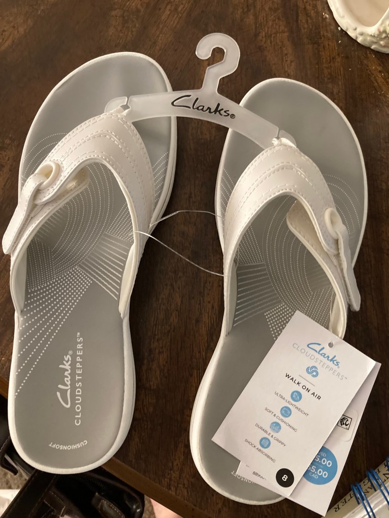 Fortunately for me the clearance aisle had $1.00 sandals. However, it didn’t take long to realize they would not be able to work long term if I wanted to walk in these sandals for longer than a brief trip. So Mom and I found the same brand “Clarks” at JCPenney the brand of my aunt’s sandals. I was extraordinarily happy to see them last Thursday. However, I didn’t get them until Monday of this week.