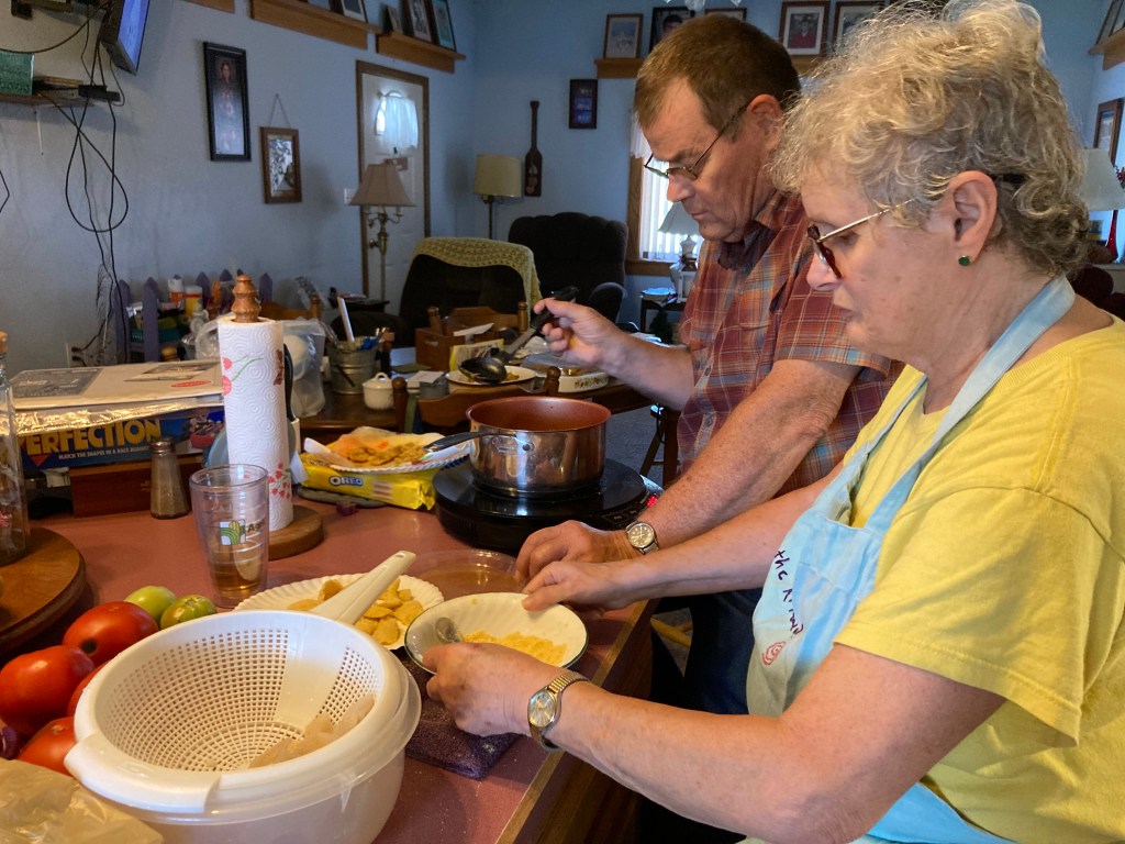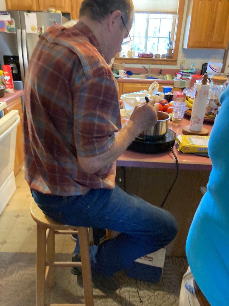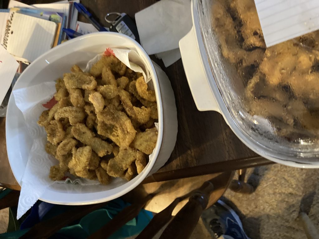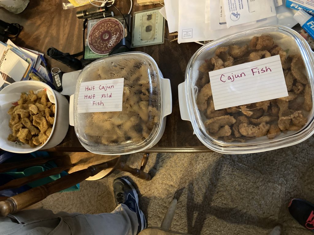 As this photo portrays Mom was Dad’s sous chef helping him in his process to fry the fish. He had Cajun, half Cajun and half Mild, and Mild. We also promised potato salad and our version of baked beans. Then my cousins brought a pork loin they had smoked so we had a wonderful variety of food that evening.