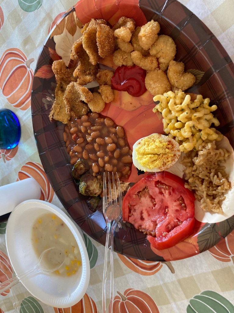 Mostly the guys caught Blue Gill. Good sized Blue Gill. Dad was afraid there wouldn’t be enough at first. I am the one who suggested Popcorn Shrimp. I thought it would help to have another type of fish and I knew a certain teenager liked it over the actual fish.