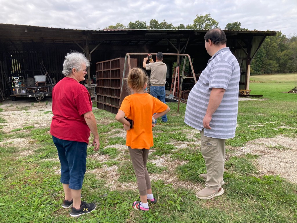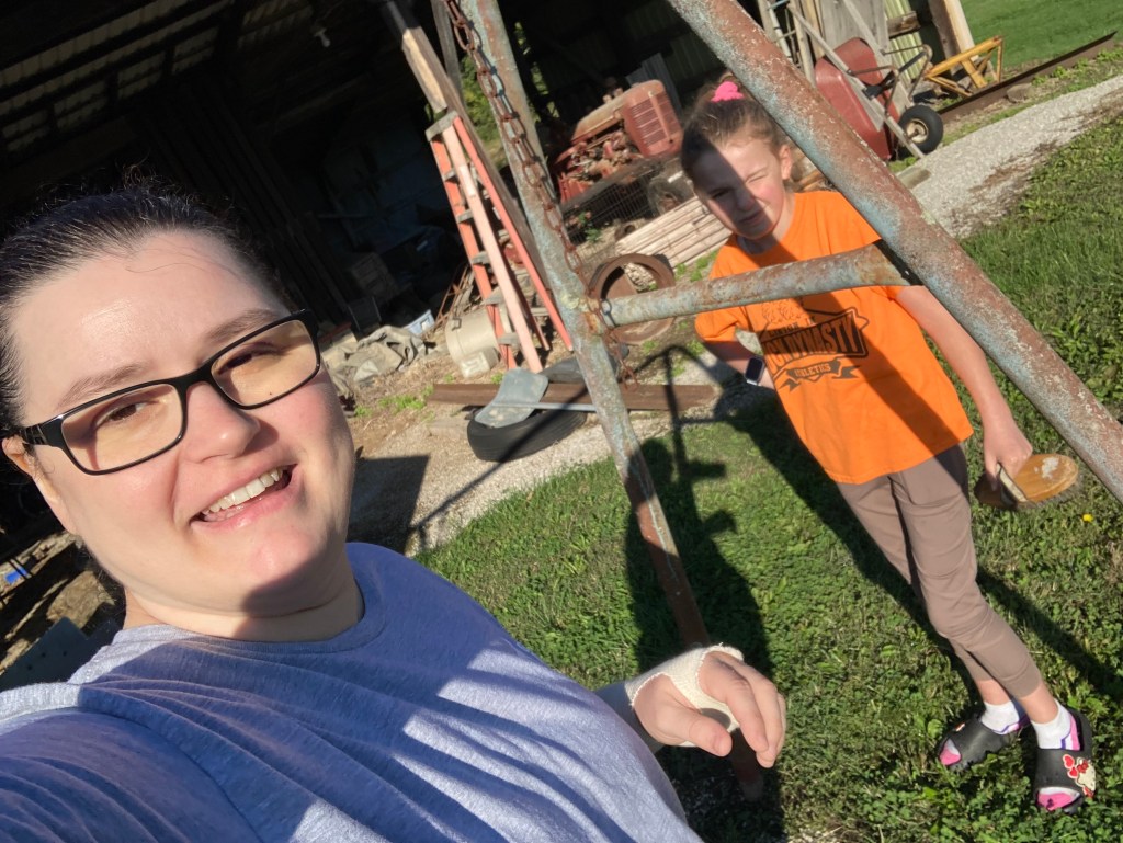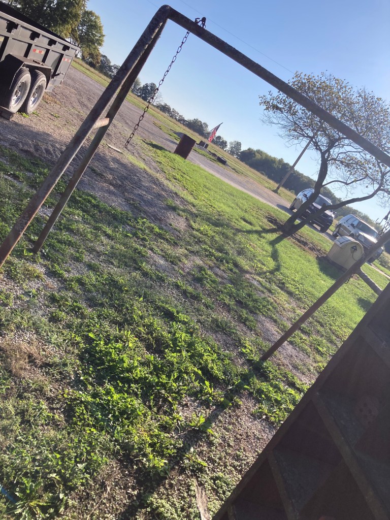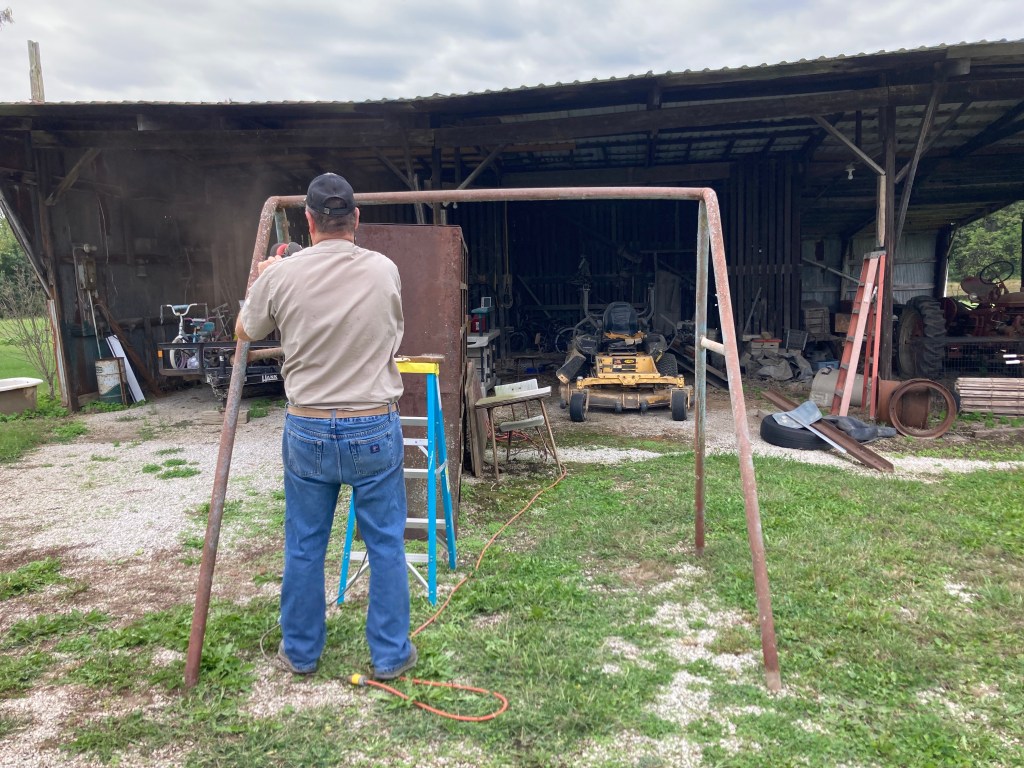 We decided after Grandma Betty’s “Fish Fry Birthday” we needed to make a change to our front porch. This is our new idea to make this swing usable once again. For weeks it was just talk, over the last day it’s become reality. Thinking about those memories doesn’t hurt my heart like it did even yesterday. Dad moved the frame from where it was behind my grandparents house to in front of our old shed. Then this morning something was in the air I felt like working on this project and the weather was perfect for it.