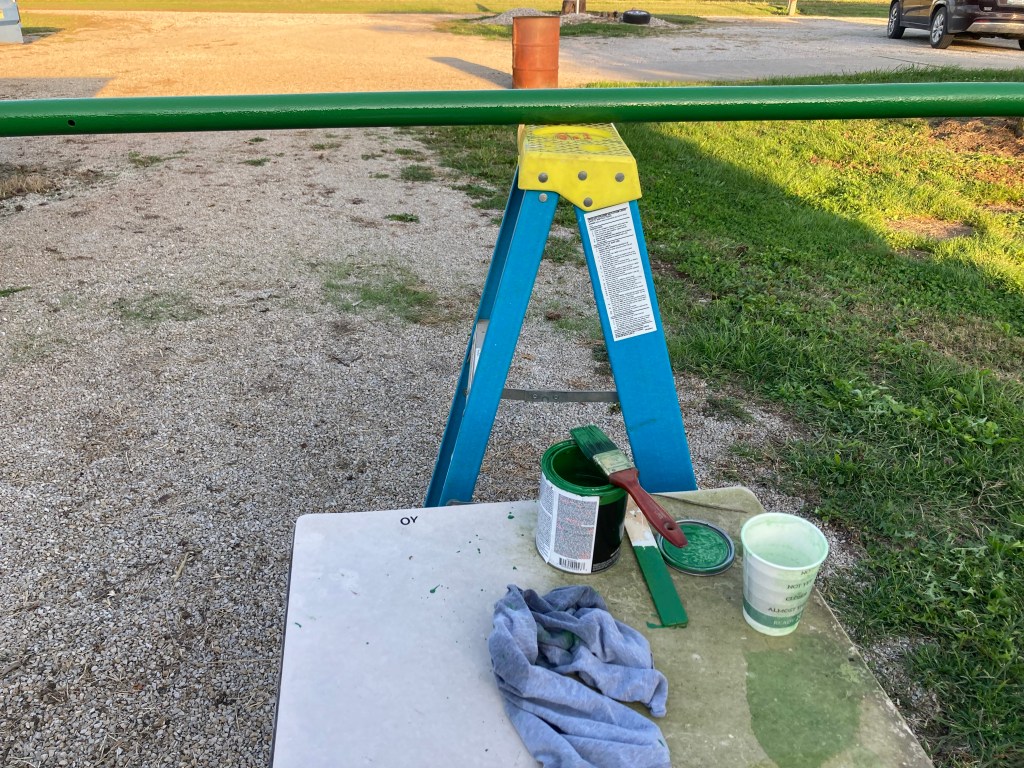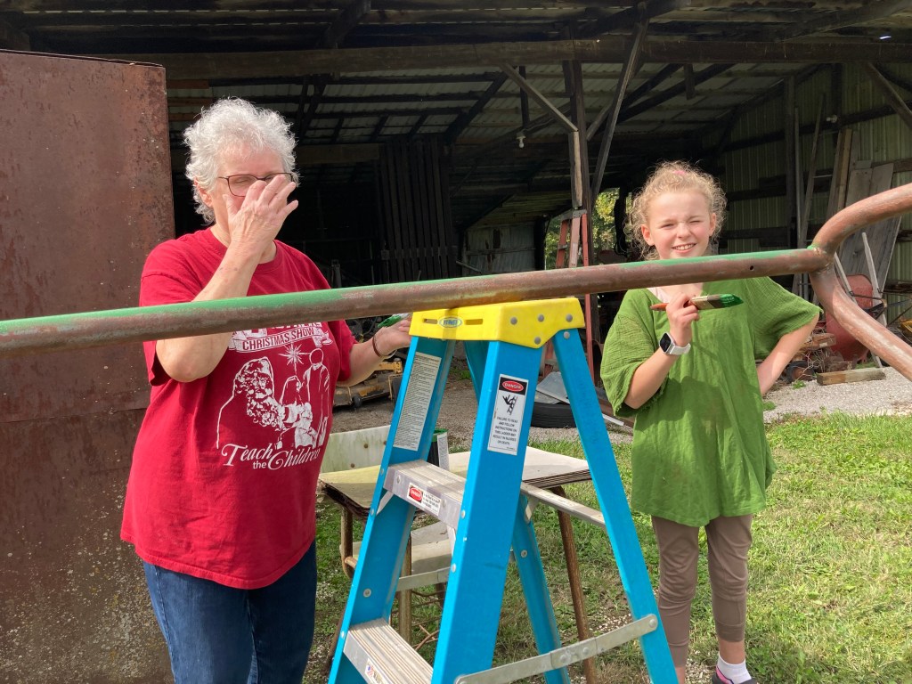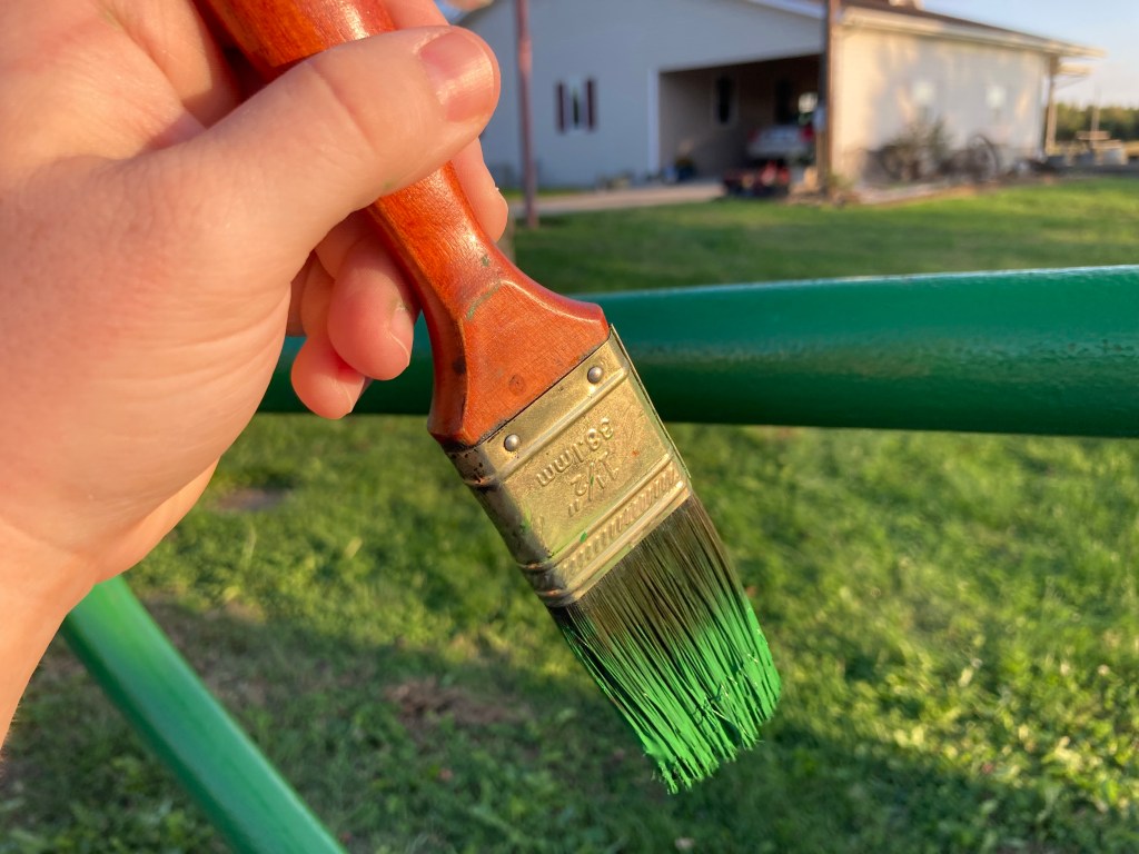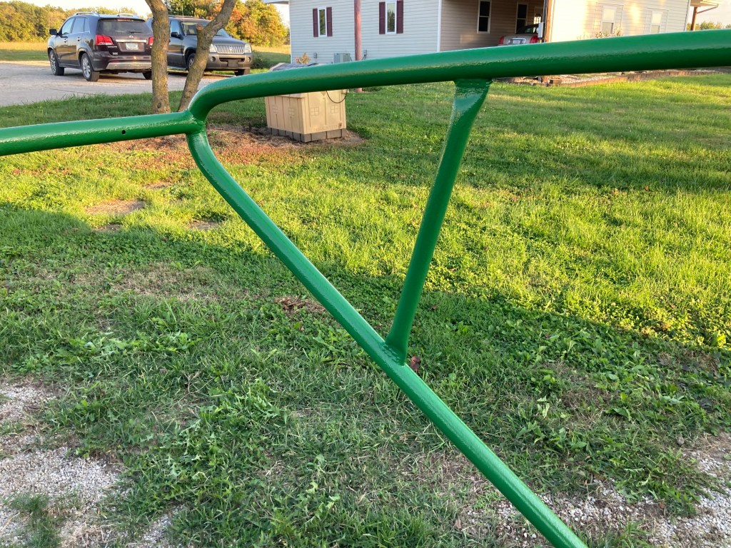 Mom and Dad did have to have a couple of conversations about the color. So Dad will have his back porch swing red and our frame we worked on today is John Deere Tractor green. Mom originally wanted something even darker.