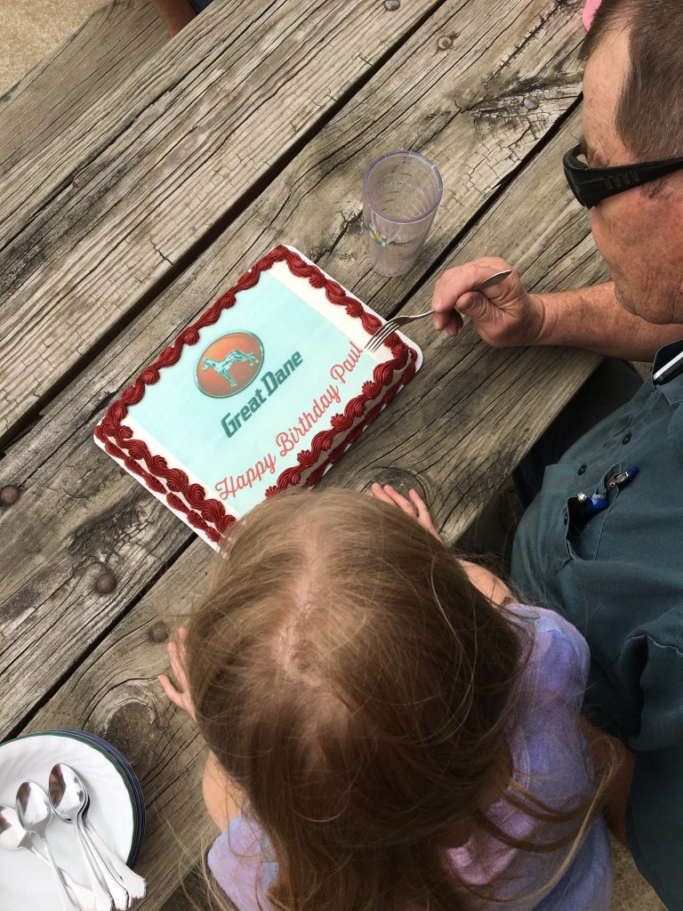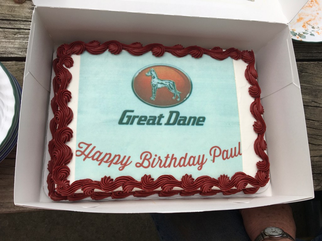 A few years ago we had a birthday cake made up for Dad that had the Great Dane insignia on it. They are going to have a party with a cake, but we won’t get to see it unless Dad or Jared take photos. We will have to mention it tomorrow if we get to see him Mom has an early test though at the hospital in Terre Haute so we may have to call to suggest the photos.